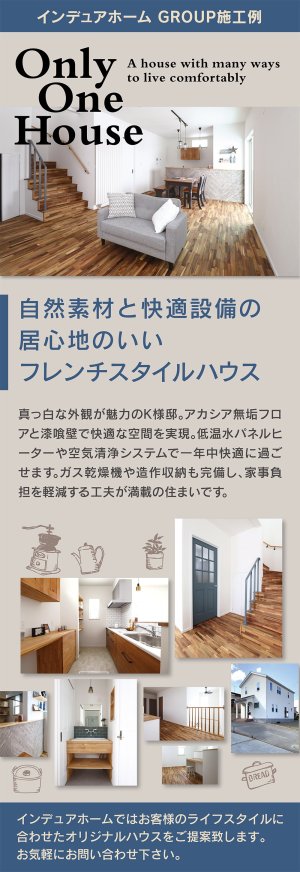 真っ白な外観が魅力のK様邸。アカシア無垢フロアと漆喰壁で快適な空間を実現。低温水パネルヒーターや空気清浄システムで一年中快適に過ごせます。ガス乾燥機や造作収納も完備し、家事負担を軽減する工夫が満載の住まいです。