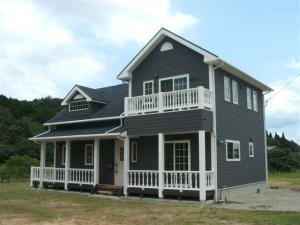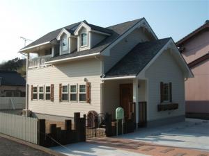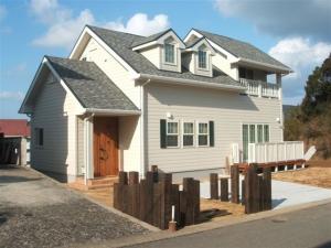 壁はラップサイディング、かわいいドーマー、ウッドデッキをつけたアメリカンスタイル。